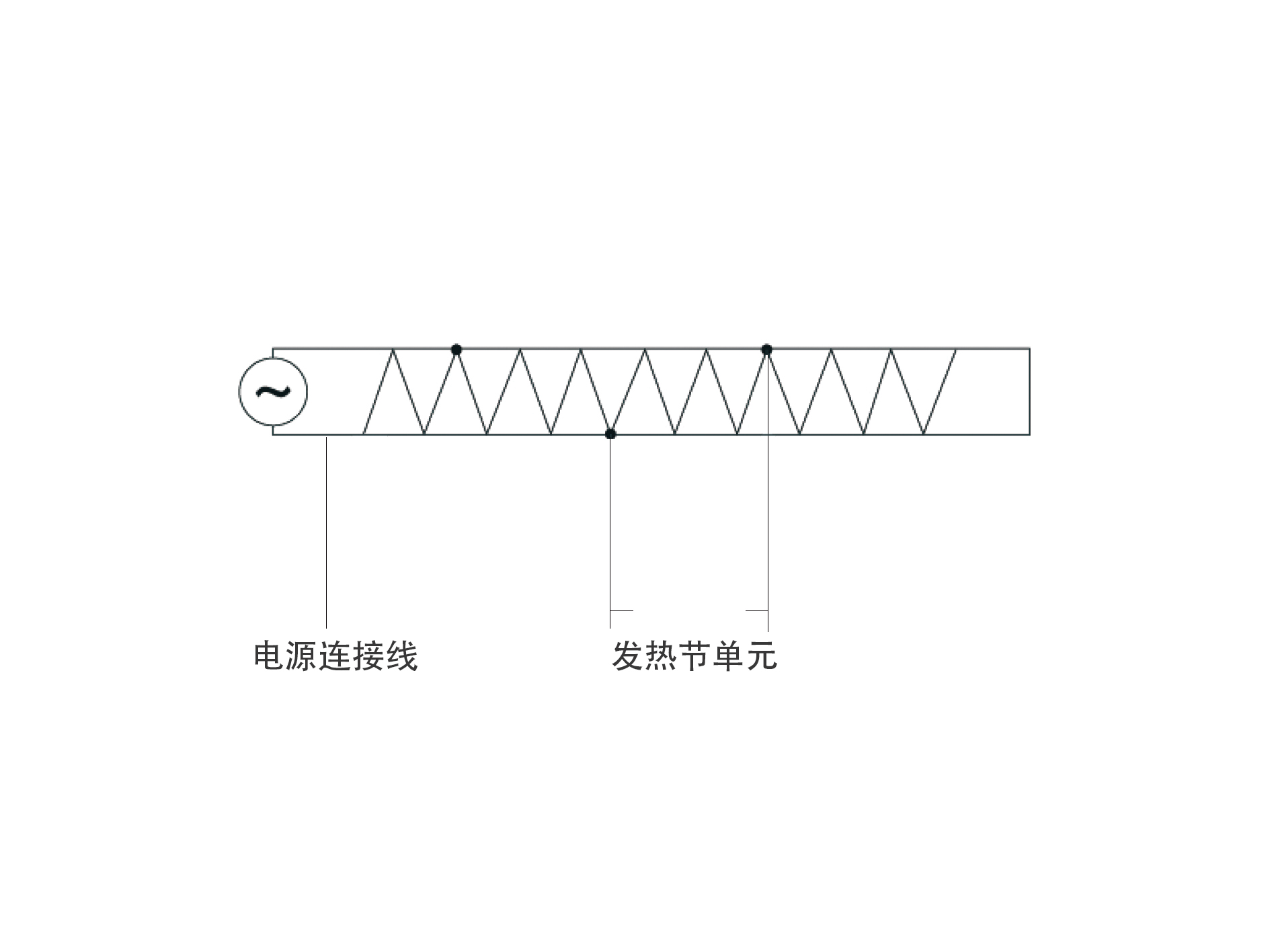 并聯恒功率電伴熱帶是由多個發熱帶在整個長度上并聯相接,簡稱為并聯恒功率電伴熱帶。兩根平行絕緣銅線作為電源母線,在其表面均勻纏繞電阻絲,并將電阻絲每隔距離(即“發熱節單元”)與母線連接形成并聯電阻。母線通電后每個并聯電阻(發熱節單元)發熱;即形成了一條連續發熱的電伴熱帶。